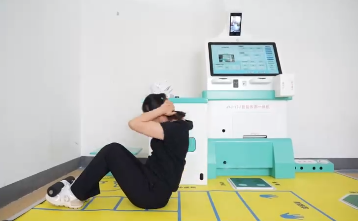 測試方法:去往仰臥起坐測試區(qū),雙腳勾住勾腳架,雙腿彎曲,雙手抱頭,聽到開始測試語音后開始測試,測試過程中,躺下時肩部必須躺平,坐起時胳膊肘必須觸膝蓋成功計數(shù)1次,如動作不標準不計數(shù),勾腳架上方有小顯示屏,實時觀看測試個數(shù)及剩余時間,倒計時為0測試結(jié)束;